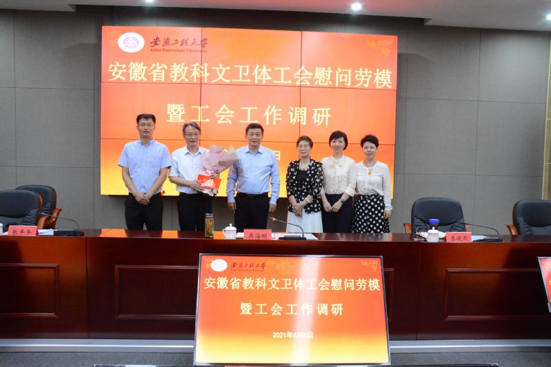 苏国红在致辞中代表学校对吴海明主席一行的到来表示热烈欢迎,向教科文卫体工会一直以来对我校工会工作的关心与支持表示诚挚感谢!她从建校历史、学科专业建设、办学指导思想、办学理念以及发展目标等方面对学校进行了介绍。对学校支持工会在选树先进模范,开展向先进学习,激发教职工主人翁责任感和昂扬向上精神状态;在聚焦增强政治性、先进性、群众性,不断强化教职工思想政治引领;在参与学校民主管理、维护服务教职工方面进行的积极探索和取得的成绩;以及全面推进二级“教工之家”和“阳光家园”等工作进行了详细介绍。她希望省教科文卫体工会领导能一如既往地支持学校工会选树更多的先进,共同唱响劳动最光荣、劳动最崇高、劳动最伟大,劳动最美丽的主旋律,为学校地方特色高水平大学建设汇聚正能量! 吴海明在讲话中对学校多年来坚持开展劳模选树工作、通过不断涵养、打造工会和女职工工作品牌取得的成绩给予了充分肯定。他希望,工会组织要深刻把握工会组织既是群团组织、也是政治组织的定位,自觉接受党对工会工作的领导,做到“党有号召、工会有行动”,团结动员广大教职工坚定不移听党话、跟党走;要在党的领导下,围绕中心、服务大局,突出重点、改革创新,以党的建设为统领,在思想引领、建功立业、维权服务、改革创新方面做好工作;同时强调要将工会工作深度融入地方经济发展,要加强属地工会的联系,发挥各自优势,形成资源互补。随后,吴海明代表省教科文卫体工会慰问了学校省五一劳动奖章获得者、机械与工程学院院长许德章,为省级女职工示范性阳光家园授牌。 慰问、授牌仪式后,苏国红陪同吴海明一行及在芜高校(附院)工会主席赴化学与环境工程学院现场考察了二级“教工之家”和女职工“阳光家园”建设情况。学院党委书记水心宝和分工会主席胡承功进行了现场介绍。化学与环境工程学院通过校工会开展的2021年二级“教工之家”和女职工“阳光家园”建设项目申报获得重点支持建设,在学院党政的重视支持下,把“教工之家”和女职工“阳光家园”纳入学院整体规划,按照建设标准高质量完成了场地和环境建设,受到了省教科文卫体工会领导和在芜高校工会主席的高度认可和肯定。