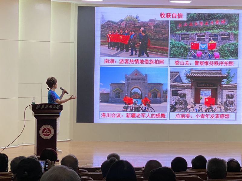 专题宣讲后,2021年中国当代徐霞客获得者、2021年芜湖市十大最美家庭赵国庆、曹锦芬教授夫妇和大家分享了他们历时13年骑行十万里,历经全国34个省、269个地级市、1087个县,打卡793个红色地点,原创两首红色歌曲,诗歌400余首,坚守红色信仰,追寻中国共产党的光辉足迹,13年间跨越过无数的惊险奇绝和艰难险阻,以不同凡响的毅力坚持完成红色骑行,为建党百年献上了一份特殊意义的厚礼《红色骑行十万里》。报告会结束后老党员们表示深受教育和感动,80高龄的张健美老师说,她是饱含热泪听完报告的;老党员荚新明老师激动的表示十分感动,十分受教育;教辅退休支部书记方鑫德说东辉老师从专业角度完整宣讲了中国共产党的历史,赵国庆,曹锦芬两位老党员则用13年的红色骑行追寻伟大的中国共产党,为党的百年华诞献上厚礼,实在了不起,值得我们学习。张寅红最后用“心中有韬略,腹中有芳华,身体有钢骨,精神有力量”为报告会做了总结。