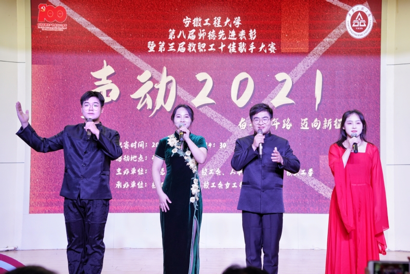 校党委常委、宣传部部长孙浩然为校第八届师德先进个人颁奖 穿插其中的十佳歌手比赛精彩纷呈,化学与环境工程学院王康、程秀仙带来的《如愿》为大家展现了军人“舍小家,为大家”的爱国情怀;数理与金融学院王辉升以一曲《再一次出发》唱响了对祖国大好河山的赞美之情,唱出了人民的美好希望;后勤保障处李萍萍、宋佳音合唱的《飞云之下》用歌声传递希望、放飞梦想;体育学院许诚老师和学生共同演绎的歌曲《九儿》传达了倔强顽强的革命浪漫主义精神;经济与管理学院徐博、高天宇凭借脍炙人口的《最炫民族风》热动全场;计算机与信息学院吕寅、孙力力用《百年红船》带领大家回顾了中国共产党成立百年的苦难与辉煌;机械工程学院杨顺独唱的《龙文》以独特的儒雅台风演绎了春风杏坛。我校退休老师崔晓明应邀献唱民族歌剧《沂蒙颂》和选曲《爱永在》,将本场比赛推向了高潮。