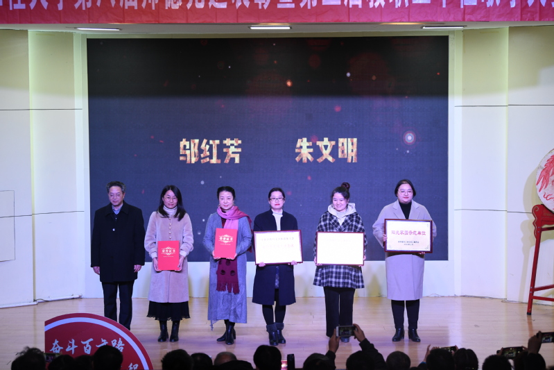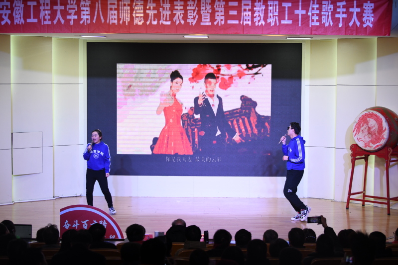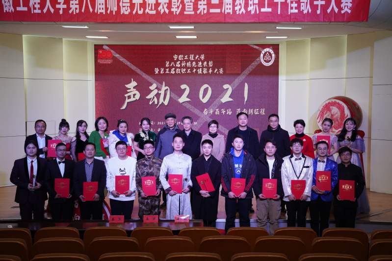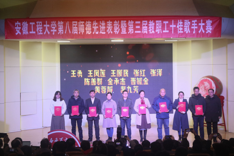 12月29日,学校在学术报告厅举办第八届师德先进表彰活动暨第三届教职工十佳歌手大赛,本次活动以“奋斗百年路 迈向新征程”为主题,旨在选树表彰师德先进,弘扬新时代奋斗精神,激发师生爱国爱校之情。校党委副书记苏国红,副校长叶常林,校党委常委、副校长郭兴众,校党委常委、副校长郑健,校关工委常务副主任、老领导肖学东,校党委常委、宣传部部长孙浩然出席活动。各二级党组织负责人、相关单位负责人及师生代表300余人参加活动。 活动现场,对全省教育系统师德先进个人,安徽省第五届普通高校青年教师教学竞赛获奖者,安徽省示范性女职工阳光家园,安徽省女职工工作先进集体及个人,校师德先进集体、标兵、个人进行了表彰,并颁发奖牌和证书。