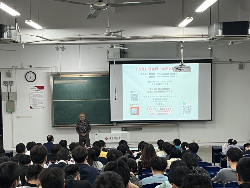 会上,赵国庆介绍了“红色骑行”的宏大主题,展示了“红色骑行”的数据,并阐述了他们为庆祝中国共产党建党100周年而骑行的初衷。一场视听盛宴让各位同学身临其境的体验中国共产党的发展历史及革命英雄的伟大事迹,让学生深刻体会到我们当今的幸福生活来之不易。曹锦芬分享了在这段十万里“红色骑行”中的巨大收获,赵国庆夫妇收获了自信,这种自信是源于中国共产党对自己的光辉历史的自信,是对百年奋斗成就的自信,也是对历史伟业的自信;收获了坚强,这种坚强是来自中国红军长征途中的那种坚定不移,永不放弃的坚强;收获了快乐,这种快乐是来自祖国大好河山的美景,各个地区人民的风土人情。曹锦芬说:“我不知道10万里有多远有多累有多难,但是每当参观完那些红色景点,我都会被那种英勇、悲壮、辉煌所震撼!” 通过这次生动精彩的党史教育课,全体同学接受了一次深刻的红色教育。在学习党的二十大精神之际,让学生做到以史修身、以史资政,坚持中国道路、弘扬中国精神、凝聚中国力量,为新时代交出合格的答卷。 (文:徐祖缘、鲁力;图:鲁力;审核:方玖胜;编辑:张玉凤) |